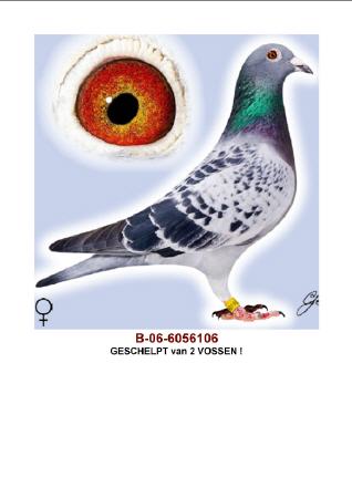 Die B-00-6548062 w "Tochter des Vos von 1998" ist ein Original Weibchen der Gebrüder Janssen aus Arendonk. Sie stammt aus der Linie des 019. Der 019 stammt aus dem Oude Merckx von 1967. Beide Tauben errangen jeweils 18 x den 1. Preis in Arendonk.
